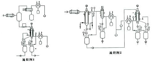 a)短程蒸餾器單級蒸餾單元: 經(jīng)預(yù)熱、脫氣后的物料進(jìn)入短程蒸餾器,輕組份被蒸發(fā)并在內(nèi)置冷凝器上冷凝,它和重組份從不同的通道分別排出(流程圖1)。 b)刮膜蒸發(fā)器和短程蒸餾器組合蒸餾單元: 大量的低沸物在刮膜蒸發(fā)器里被除去,產(chǎn)品的蒸餾在后級的短程蒸餾器里產(chǎn)生(流程圖2)。 |